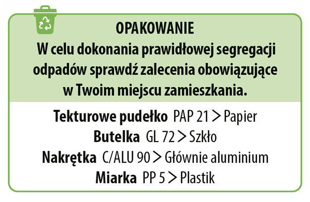 Po otwarciu należy przechowywać w lodówce i zużyć w ciągu 30 dni. Ewentualne występowanie nierozpuszczonych drobinek wynika z wysokiego stężenia ekstraktów i nie wpływa na jakość produktu.
