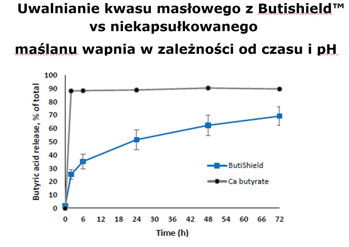 Unikalna opatentowana technologia produkcji microPEARLS™ zapewnia efekt przedłużonego i kontrolowanego uwalniania kwasu masłowego w przewodzie pokarmowym. W porównaniu z nieotoczkowanym maślanem wapnia, Butishield jest znacznie bardziej odporny na rozkład w niższym pH początkowych odcinków układu pokarmowego a tym samym większa jego część dociera do jelita grubego gdzie jest najbardziej potrzebny.