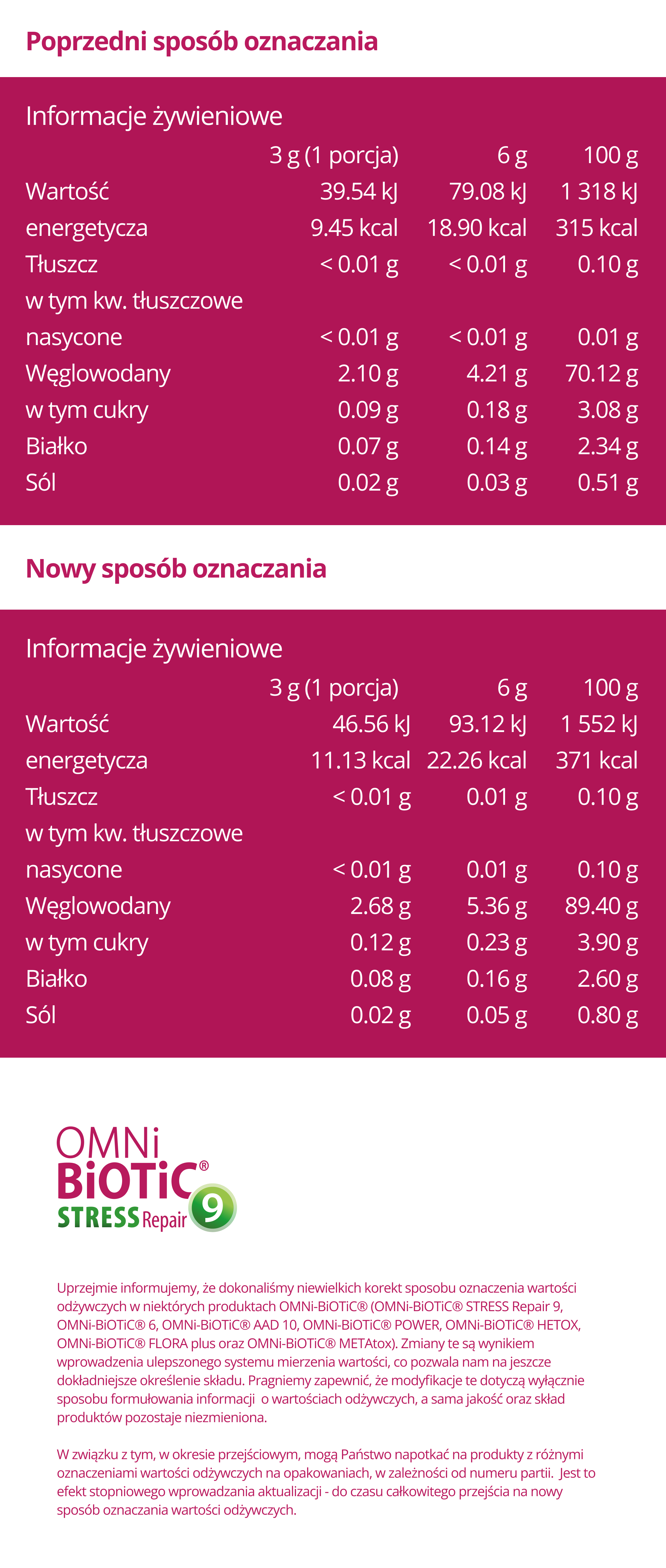 OMNi-BiOTiC® STRESS Repair 9 – zawiera 7,5 miliarda (=7,5 x 10⁹ / porcja) bakterii jelitowych z 9 różnych szczepów w jednej porcji. (1,5 x 10¹⁰ CFU) bakterii w 2 porcjach.