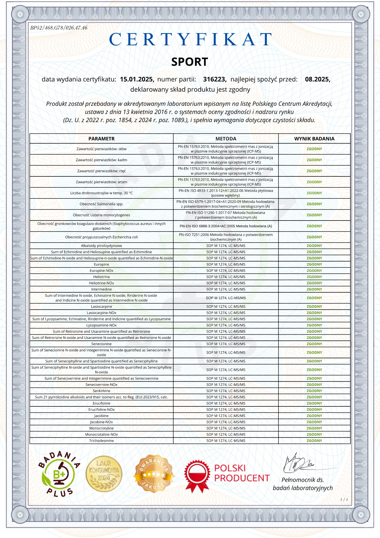 “Badania plus” to znak, który informuje, że produkt został przebadany laboratoryjnie (tylko i wyłącznie w laboratoriach akredytowanych) oraz spełnia wymogi czystości składu i zawartości. W Państwa ręce trafiają tylko produkty, których wyniki są w 100% pozytywne.