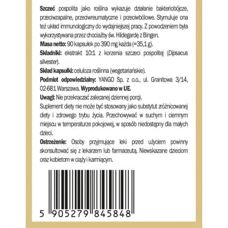 Składniki: ekstrakt 10:1 ze szczeci pospolitej (Dipsacus silvester); kapsułka: celuloza roślinna.